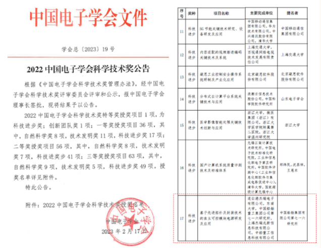 中國電子學(xué)會(huì)科學(xué)技術(shù)獎(jiǎng)由國家科學(xué)技術(shù)獎(jiǎng)勵(lì)工作辦公室批準(zhǔn)設(shè)立,2003年設(shè)立以來已連續(xù)評(píng)選19屆,作為國內(nèi)電子信息領(lǐng)域的最高獎(jiǎng)項(xiàng),2022年度獲獎(jiǎng)成果由數(shù)十名院士歷經(jīng)三輪評(píng)審,從三百余個(gè)項(xiàng)目中遴選,此次獲獎(jiǎng)實(shí)屬不易。